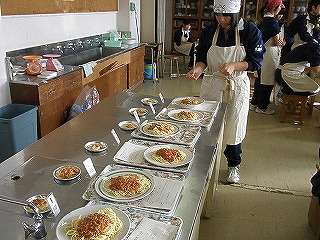 今日は終業式ですが、廊下にいい匂い「スパゲッティミートソース」作り☆2年3組が調理実習(その1)