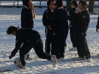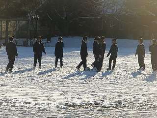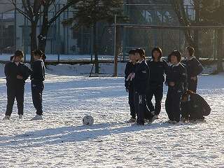 12月17日(金)前日から降った雪が残る校庭で、ソフトボール部が部活動に取り組んでいました。なんと、サッカーで体力作りの最中でした。せっかくですのでHPに掲載しました。
