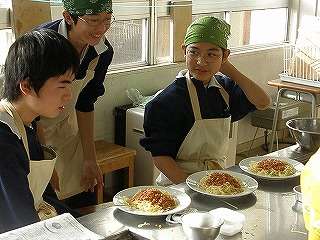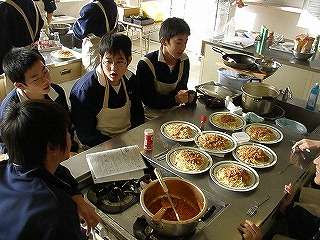 今日は終業式ですが、廊下にいい匂い「スパゲッティミートソース」作り☆2年3組が調理実習(その6)