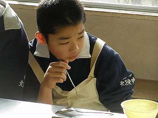 12月24日(金)の1、2校時、調理室前の廊下を通過すると「いい匂い」がしてきました。今日は2年3組さんが「スパゲッティミートソース」の調理実習をしていました。2校時は授業がありませんでしたので、試食の様子を撮影することができました。最後の学級です。食べる人は1回ですが、担当の高橋先生は6回試食します。結構大変です。今回は調理しているところは撮影できませんでした。