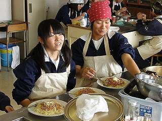 今日は終業式ですが、廊下にいい匂い「スパゲッティミートソース」作り☆2年3組が調理実習(その8)