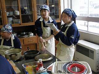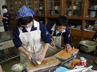 12月20日(月)の2、3校時、調理室前の廊下を通過すると「いい匂い」がしてきました。今日は2年6組さんが「スパゲッティミートソース」の調理実習をしていました。3校時は授業がありましたので、試食の様子を撮影することができませんでした。今回は調理しているところはしか撮影できませんでした。