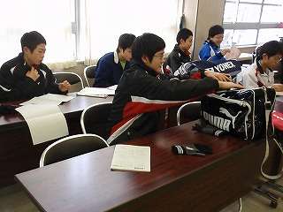 1月5日(水)の男子バドミントン部の1日の様子を撮影しました。朝部活動開始時刻よりも早く登校し、生徒昇降口前の雪かき。終了すると部活動開始時刻まで、学習会。昼食は顧問の先生直々の「あんこ餅」を食べ、部活動が始まりました。