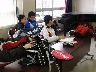 1月5日(水)の男子バドミントン部の1日の様子を撮影しました。朝部活動開始時刻よりも早く登校し、生徒昇降口前の雪かき。終了すると部活動開始時刻まで、学習会。昼食は顧問の先生直々の「あんこ餅」を食べ、部活動が始まりました。