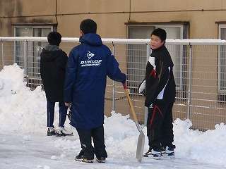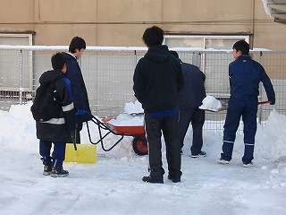 1月6日(木)男子卓球部の活動前に、「みたけ活動センター」の雪運びを行いました。駐車場の除雪が完了し、置かれた雪を一輪車で運搬しました。その後、部活動が始まりました。