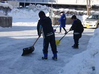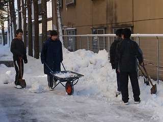 1月6日(木)男子卓球部の活動前に、「みたけ活動センター」の雪運びを行いました。駐車場の除雪が完了し、置かれた雪を一輪車で運搬しました。その後、部活動が始まりました。