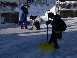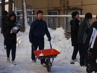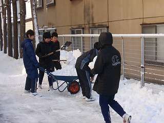 1月6日(木)男子卓球部の活動前に、「みたけ活動センター」の雪運びを行いました。駐車場の除雪が完了し、置かれた雪を一輪車で運搬しました。その後、部活動が始まりました。