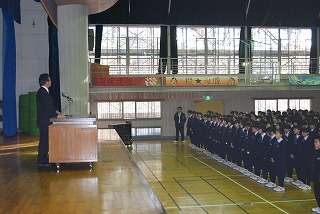 1月14日(金)、3学期の始業式で校長先生から次のようなお話しがありました。「まず冬休み中は大きな事故もなく自立した生活を過ごしていたようです。そして、3年生は私立高校の入試を、1・2年生は毎日の部活動をがんばっていました。3学期は、今日から明日へ、一日一日を大切に過ごしてほしい。そして、社会に通用する次のような習慣を身につけていきましょう。1、いつでもどこでもだれとでもあいさつをしよう。2、すっと立つ姿勢を身につけよう。3,聞くときは集中して話を聞く、活動するときは活発に活動するというような態度作りをがんばりましょう。」