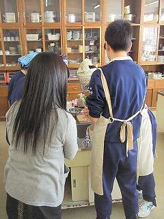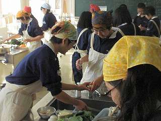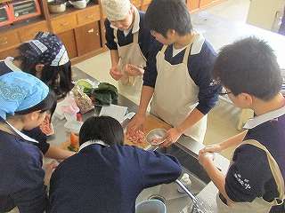 2月10日(木)の1,2校時、2年2組が調理実習を行っていました。材料は同じですが、班で様々な献立を作っていました。今まで、キュウリの切り方から始まってスパゲッティーや、ムニエルを作ったり、いろいろなメニューに挑戦してきました。今日が最終回ではないでしょうか?