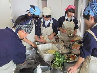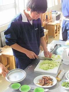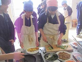 2月14日(月)の3,4校時、2年6組が調理実習を行っていました。材料は同じですが、班で様々な献立を作り、お弁当のおかず作りしていました。今まで、キュウリの切り方から始まってスパゲッティーや、ムニエルを作ったり、いろいろなメニューに挑戦してきました。今日が最終回ではないでしょうか?