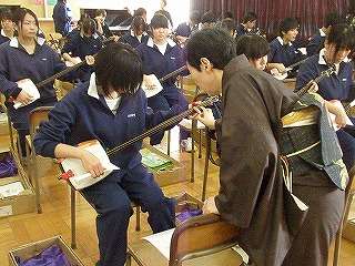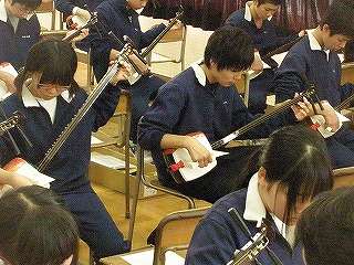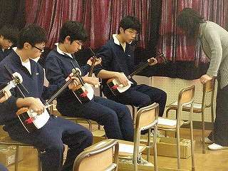 1月27日(木)と28日(金)の2日間、3年生の全学級が『三味線』に挑戦しました。先生はじめ5人の先生方の指導で、何とか弾くことができました。三味線は独特の音色がします。三味線の特徴、音色、演奏方法の指導を受け、さらに曲の演奏に挑戦しました。真剣に三味線弾きに向かっている3年生の姿が印象的でした。