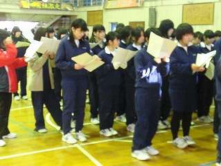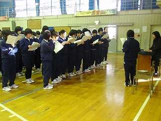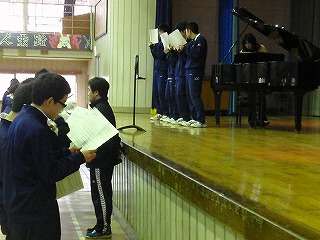 2月21日(月)の6校時、卒業式の合唱練習が3年生でも始まりました。今まで、昼休みを使って、リーダーが練習をしてきましたが、全体での練習は今日が初めてです。最後の授業で、精一杯の合唱を披露するため頑張ります。