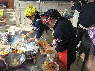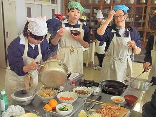 2月10日(木)の3,4校時、2年4組が調理実習を行っていました。材料は同じですが、班で様々な献立を作っていました。今まで、キュウリの切り方から始まってスパゲッティーや、ムニエルを作ったり、いろいろなメニューに挑戦してきました。今日が最終回ではないでしょうか?
