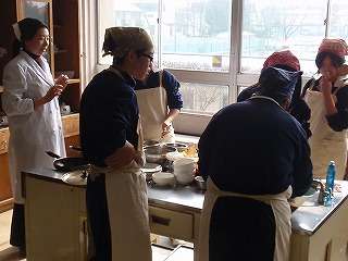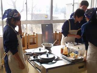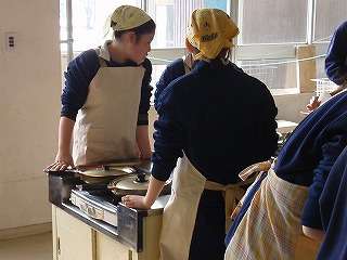 2月25日(金)の4校時、調理室から「賑やかな声」が聞こえてきました。中を覗くと3年1組が調理実習の最中でした。お好み焼きとフルーツヨーグルト作りに取り組んでいました。さすが3年生で「見事な焼き具合のお好み焼き」「おいしそうに盛りつけられたフルーツヨーグルト」を作る班。どうも真っ黒なお好み焼きで悪戦苦闘している班もありました。みんな、和気藹々と実習をしていました。