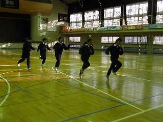 3月になりました。比較的暖かい朝でした。朝のトレーニングは7時20分から始まっています。高校進学が決まった3年生も一緒に参加してのトレーニングが続いています。駅伝選手や男女バスケ部は、ロード練習に出ました。卒業まで、あと1週間です。