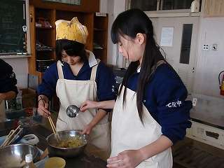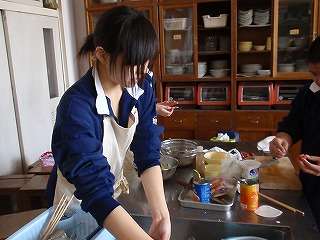 2月24日(木)の4校時、調理室から「賑やかな声」が聞こえてきました。中を覗くと3年5組が調理実習の最中でした。お好み焼きとフルーツヨーグルト作りに取り組んでいました。さすが3年生で「見事な焼き具合のお好み焼き」「おいしそうに盛りつけられたフルーツヨーグルト」を作る班。どうも真っ黒なお好み焼きで悪戦苦闘している班もありました。みんな、和気藹々と実習をしていました。