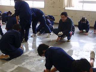 3月4日(金)の5校時、全校で1年間使った教室の床磨きを行いました。教室の床磨きは1年ぶりです。1,2年生はワックスがけを行いましたが、3年生は9日(水)に教室のワックスがけを行います。