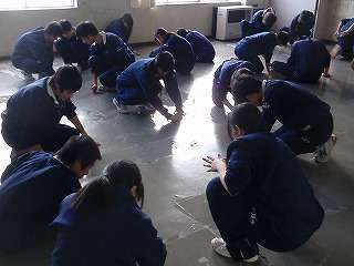 3月4日(金)の5校時、全校で1年間使った教室の床磨きを行いました。教室の床磨きは1年ぶりです。1,2年生はワックスがけを行いましたが、3年生は9日(水)に教室のワックスがけを行います。