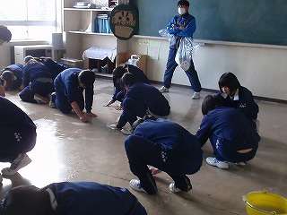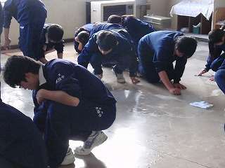 3月4日(金)の5校時、全校で1年間使った教室の床磨きを行いました。教室の床磨きは1年ぶりです。1,2年生はワックスがけを行いましたが、3年生は9日(水)に教室のワックスがけを行います。
