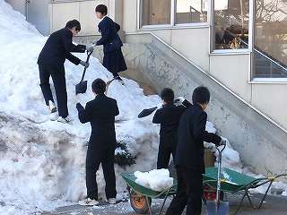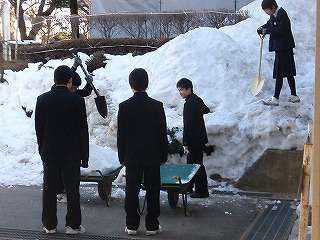 3月です。3月4日(金)の朝、今朝も3年生の「雪かき隊のボランティア隊」が登場し、雪割りと雪運びをしました。いよいよ3月です。