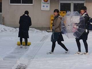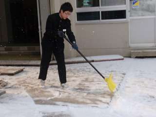 いよいよ卒業式まで3日となりました。この日は朝から雪降りの天気です。雪ベラをかたづけてしまいましたが、再度出動しました。3月11日(金)の朝、今朝も3年生の「雪かき隊のボランティア隊」が登場し、雪かきをしました。いよいよ卒業まで3日間です。