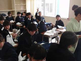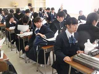 ※3月15日(火)「盛岡市立北陵中学校第37回卒業証書授与式」終了後、学級で担任の先生から卒業証書をもらう4組の生徒の様子です。!