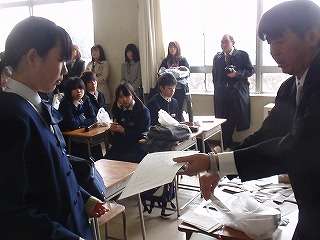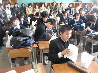 ※3月15日(火)「盛岡市立北陵中学校第37回卒業証書授与式」終了後、学級で担任の先生から卒業証書をもらう5組の生徒の様子です。!