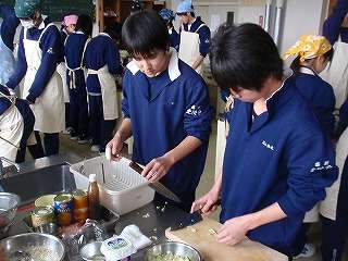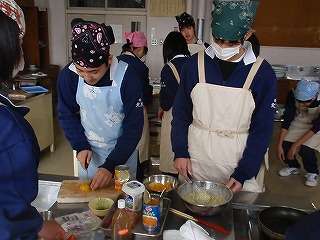 3月3日(木)の4校時、調理室から「賑やかな声」が聞こえてきました。中を覗くと3年6組が調理実習の最中でした。お好み焼きとフルーツヨーグルト作りに取り組んでいました。さすが3年生で「見事な焼き具合のお好み焼き」「おいしそうに盛りつけられたフルーツヨーグルト」を作る班。どうも真っ黒なお好み焼きで悪戦苦闘している班もありました。みんな、和気藹々と実習をしていました。