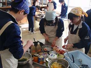 ※3月3日(木)3年6組の調理実習の様子です。今日の写真撮影は、高橋先生とスクールトライアルの久道くんが取材に行きました。スクールトライアルの久道くんは今日が北陵中最終日でした。感謝感謝です。!