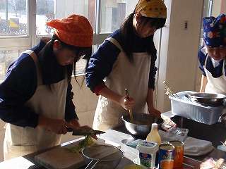 2月23日(水)の4校時、調理室から「賑やかな声」が聞こえてきました。中を覗くと3年7組が調理実習の最中でした。お好み焼きとフルーツヨーグルト作りに取り組んでいました。さすが3年生で「見事な焼き具合のお好み焼き」「おいしそうに盛りつけられたフルーツヨーグルト」を作る班。どうも真っ黒なお好み焼きで悪戦苦闘している班もありました。