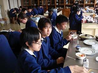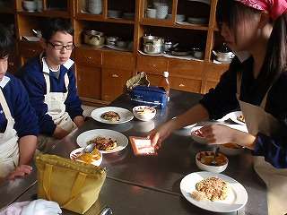 2月25日(金)の4校時、調理室から「賑やかな声」が聞こえてきました。中を覗くと3年1組が調理実習の最中でした。お好み焼きとフルーツヨーグルト作りに取り組んでいました。さすが3年生で「見事な焼き具合のお好み焼き」「おいしそうに盛りつけられたフルーツヨーグルト」を作る班。どうも真っ黒なお好み焼きで悪戦苦闘している班もありました。みんな、和気藹々と実習をしていました。