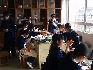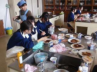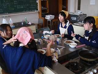 2月24日(木)の4校時、調理室から「賑やかな声」が聞こえてきました。中を覗くと3年5組が調理実習の最中でした。お好み焼きとフルーツヨーグルト作りに取り組んでいました。さすが3年生で「見事な焼き具合のお好み焼き」「おいしそうに盛りつけられたフルーツヨーグルト」を作る班。どうも真っ黒なお好み焼きで悪戦苦闘している班もありました。みんな、和気藹々と実習をしていました。