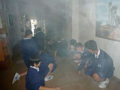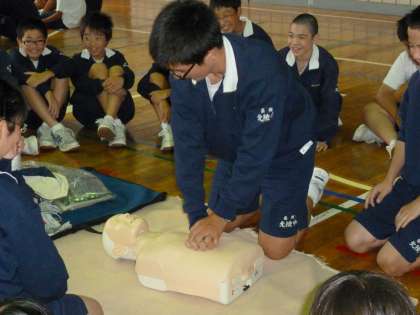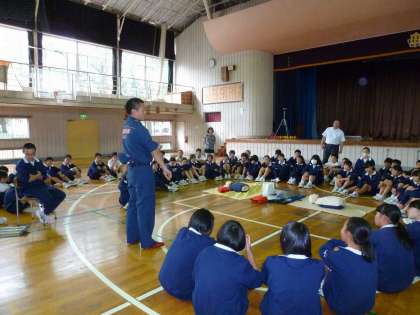 9月8日(火)、2年生が総合的な学習の時間で防災学習を実施しました。滝沢消防署から職員の方に指導に来ていただき、防災についての講話をいただいた後「心配蘇生法」「煙体験」「119番疑似体験」などを体験し、防災意識を高めることができました。