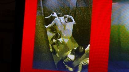 2枚目は、うーんなんでしょう?煙の中を逃げる生徒たちを映し出しているモニターの絵でしょうか?