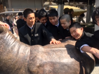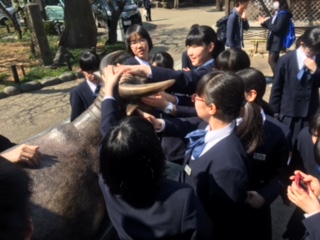 天神様は牛に縁のある神様。湯島天神のこの撫で牛は、自分の体の悪いところをさするとよくなるというご利益があるんですよね。中学生がそんなに悪いところないと思うけどなぁ、みんな一生懸命撫でています。