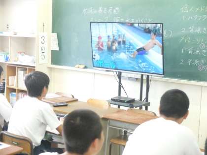 3年男子体育です。DVDを見て、背泳ぎのキックの仕方を学んでいます。