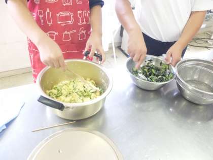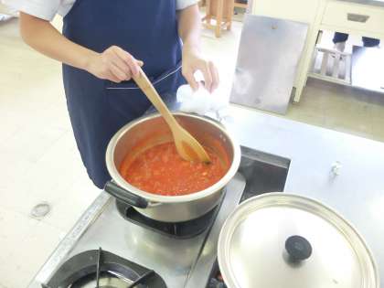 農園で採れた野菜を使って、きゅうりの酢の物、トマトのサラダ、トマトソース、ポテトサラダを作っていました。