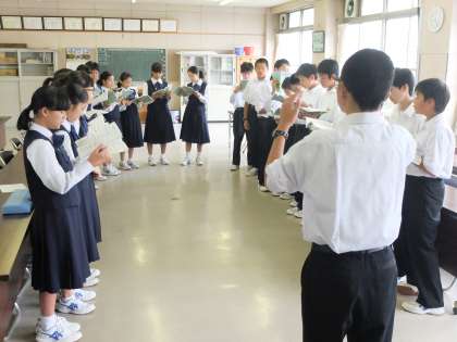朝の会の時間に1年3組が合唱練習しています。