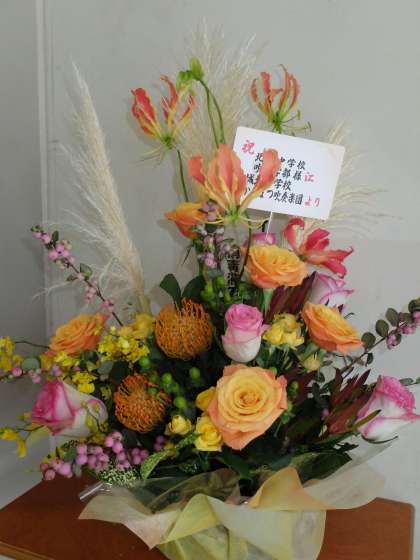 吹奏楽部の定期演奏会でいただいたお花が玄関前を飾っています。