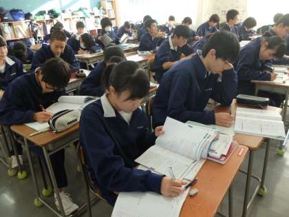 1組です。期末テストに向けて、ワークなど復習を行ってテスト勉強していました。
