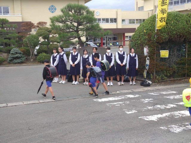 あいにくの曇り空でしたが、中学生と小学生が一緒に、元気な挨拶を交わしていました。