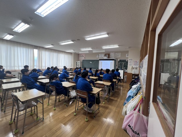 本来は体育館に全校が集まりお話を聞く予定でしたが、各教室への配信の形でゲストティーチャー講話を開催しました。