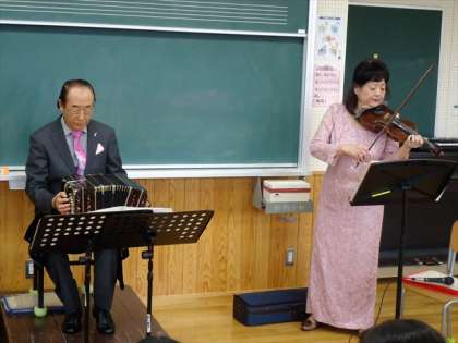 本校の文化祭、卒業式の全校合唱で歌っている「ふるさとに抱かれて」の作曲にご尽力いただいた皆さんです。「バンドネオン」という珍しい楽器を操る森川さんは、日本で20人といないバンドネオンのプロ演奏者の一人です。