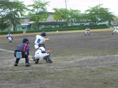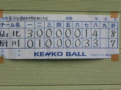雨の中、予定より30分早く対仙北中の試合が始まりました。結果は延長特別ルールの結果、7:8で惜敗。リードされ、最終回に追いつきましたが、一歩及びませんでした。