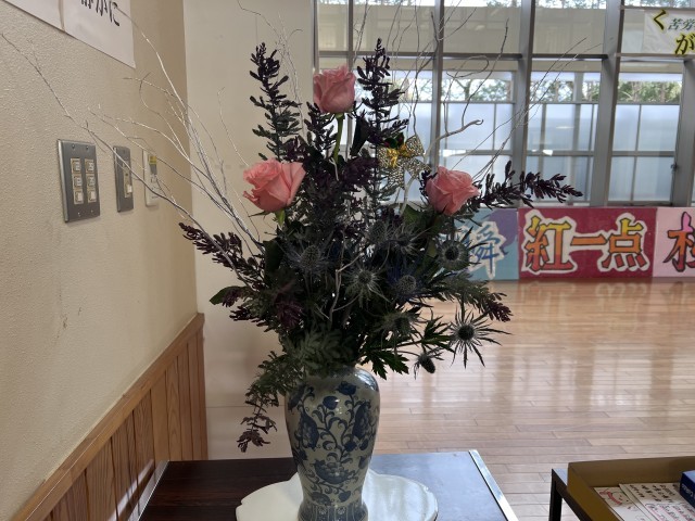 職員玄関前にはいつも綺麗なお花を飾っていただいています。今回のお花は薔薇が一際目...