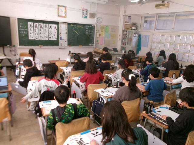 4年生の書初めは、「美しい心」を書きました。