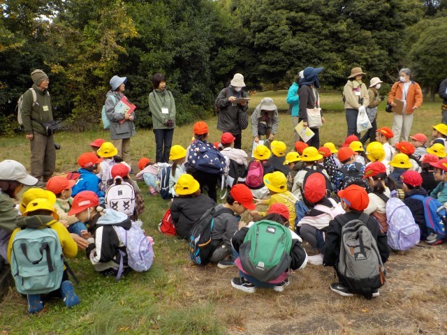 2年生のお兄さんお姉さんに手を引かれ、和田掘り公園へ生活科見学に行きました。