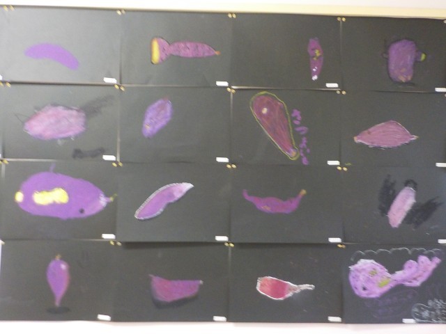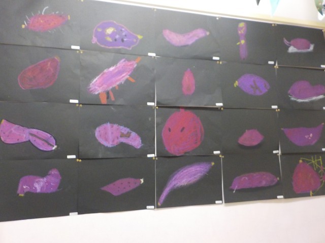 収穫したサツマイモをよく見て、絵をかきました。サツマイモは一人一個持ち帰りました。