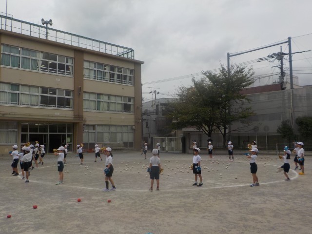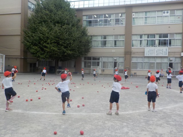 笛の合図で籠をめがけて力いっぱい球を投げ、練習も本気でがんばっています。