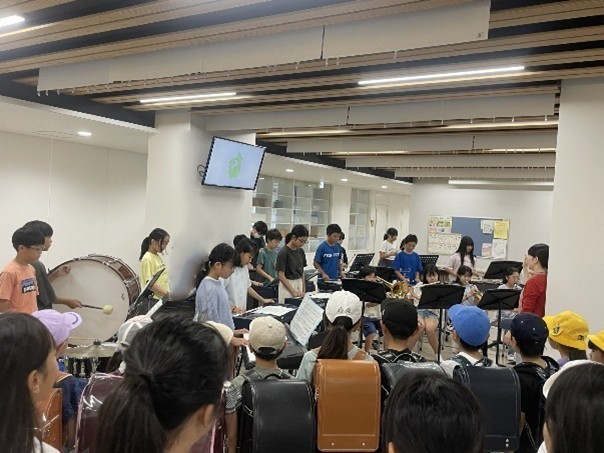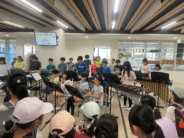 8時ちょうどの登校開始と共に、児童昇降口のピロティで「夢をかなえてドラえもん」の演奏が始まりました。